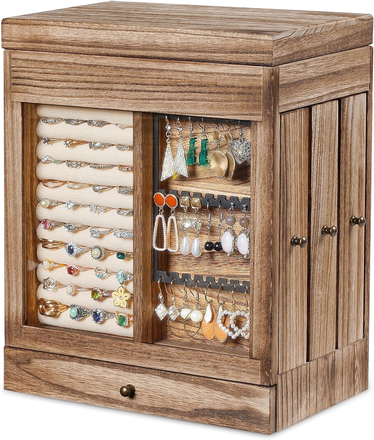 • High-Quality Material: Crafted from torched finished carbonized black wood on the outside and fine linen lining on the inside, high-quality metal for earring holder section, jewlery box with rustic look, vintage and elegance style, will goes well with your room d??cor, protect your valuables all sided quality protection from scratches, tarnishes and dust