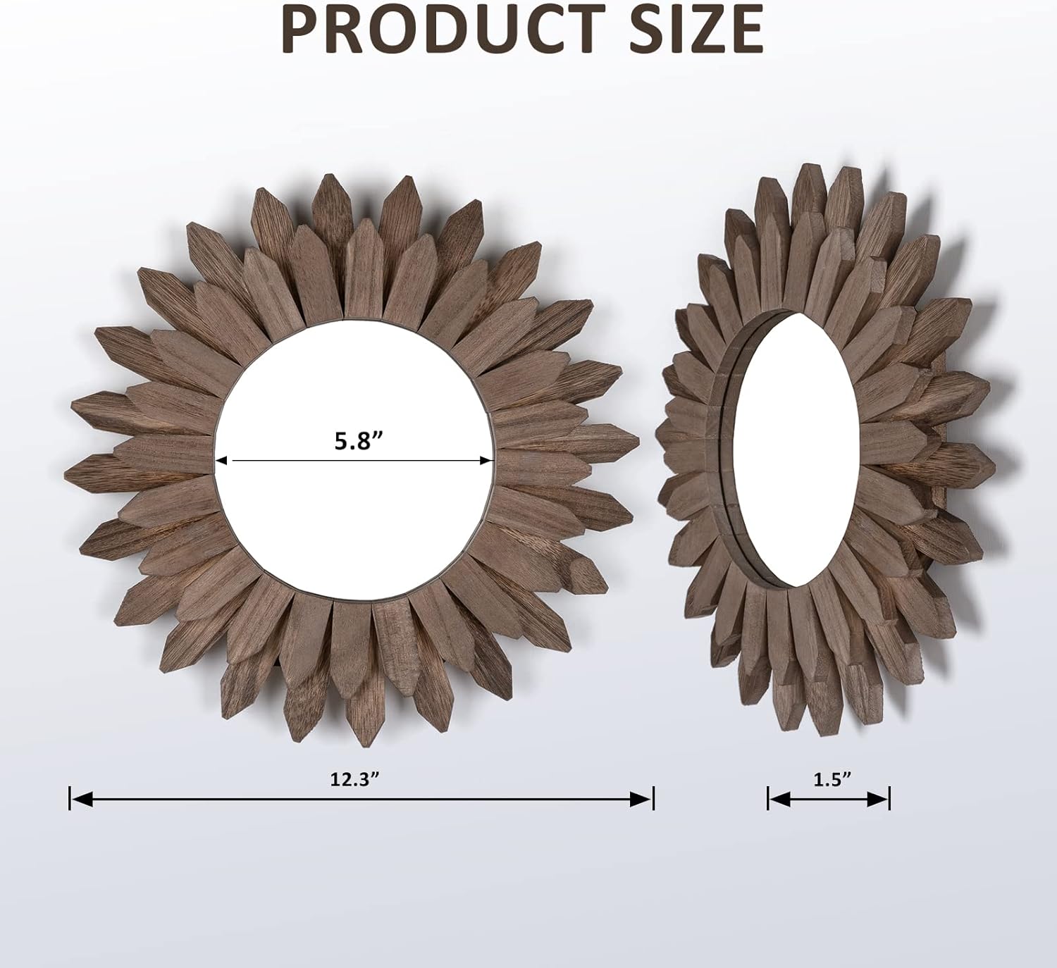 • Easy to Hang: Come with set of 2, measure at 12 inch diameter with wood frame and diameter of 5.8 inch for mirror; Hang this stunning mirror in your bedroom over your bed, in your hallway or entryway, over your living room sofa.No any assembly, quite easy to hang on the wall; Comes with anchor and screw