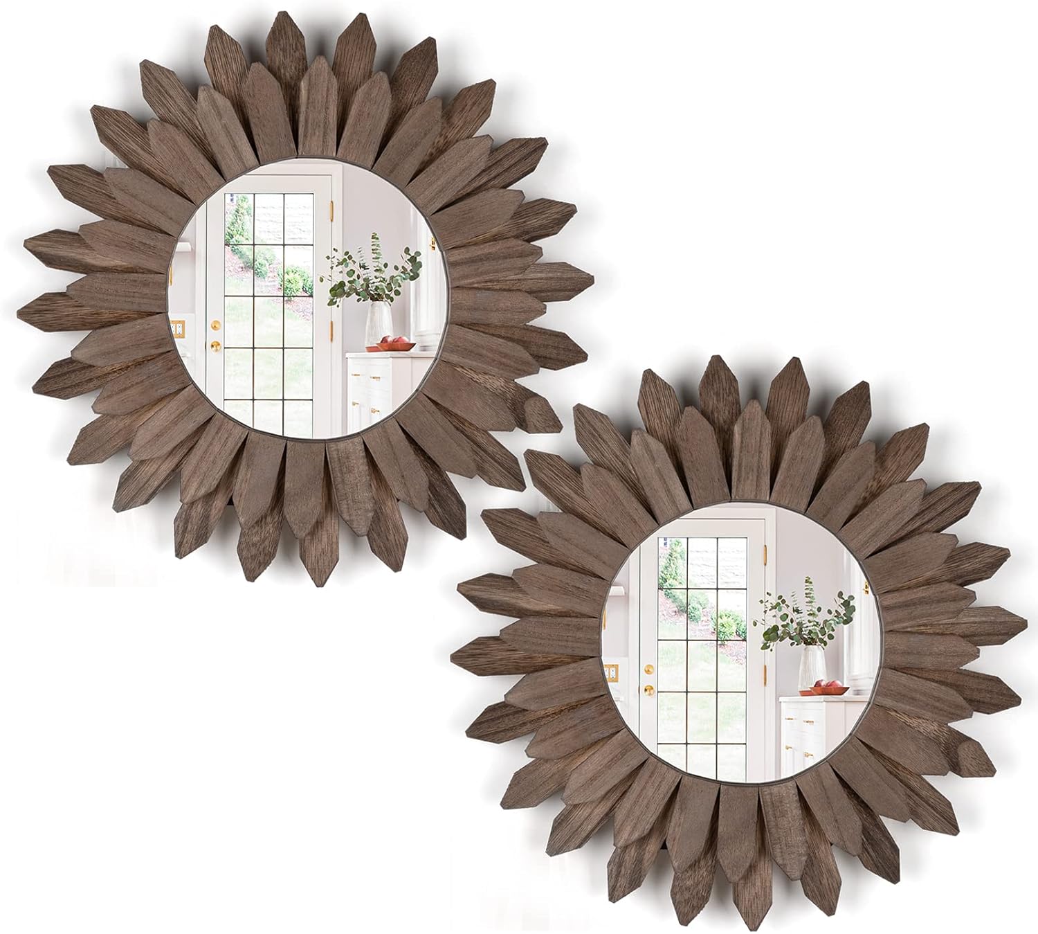 Honiway Boho Wall Decor Mirror 12 inch 2 Pack Wall Mirrors Decorative with Rustic Wood Sunburst Framed for Wall Decoration Room Decor Farmhouse Home Decor Weathered Walnut